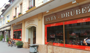 Nabídka drůbeže, ryb, kávy, kečupů a dalšího potravinového zboží.